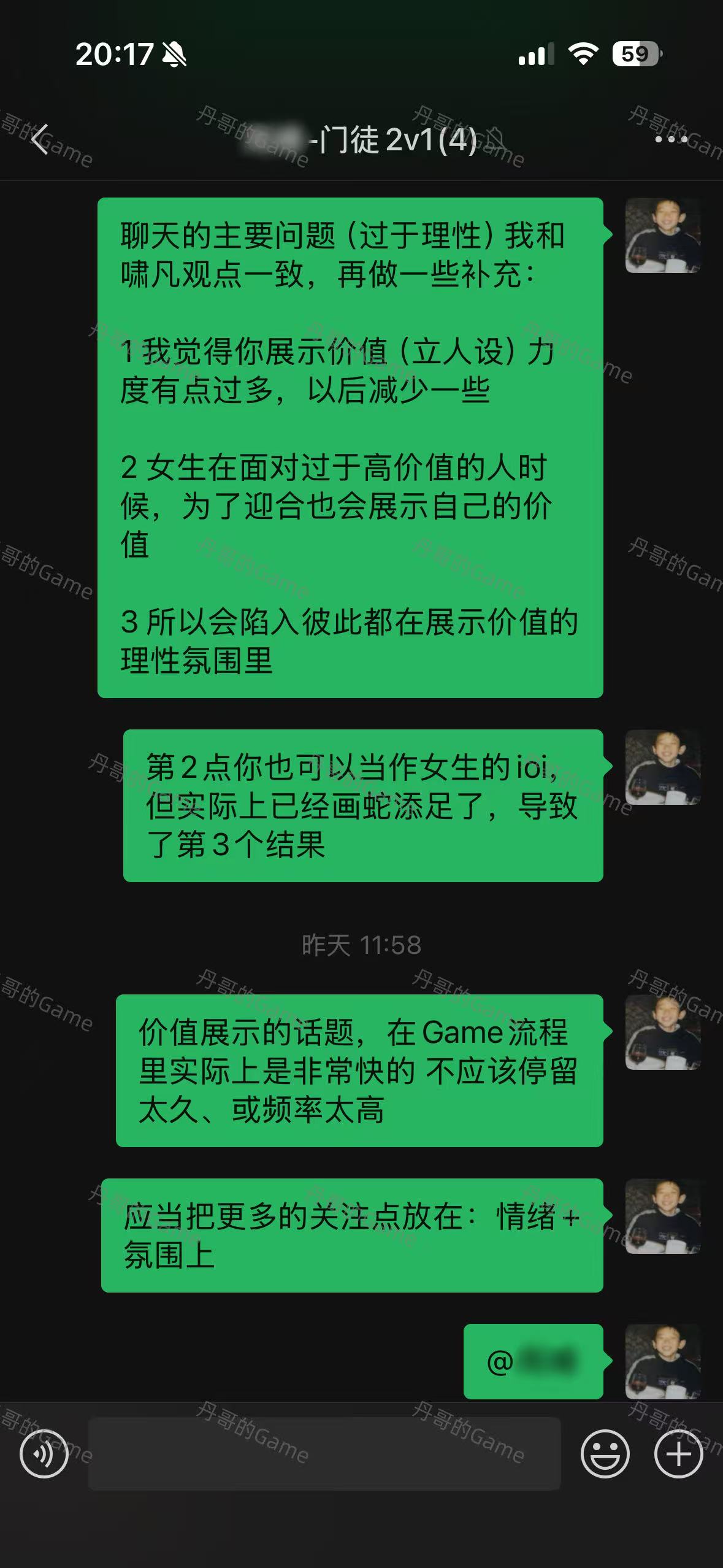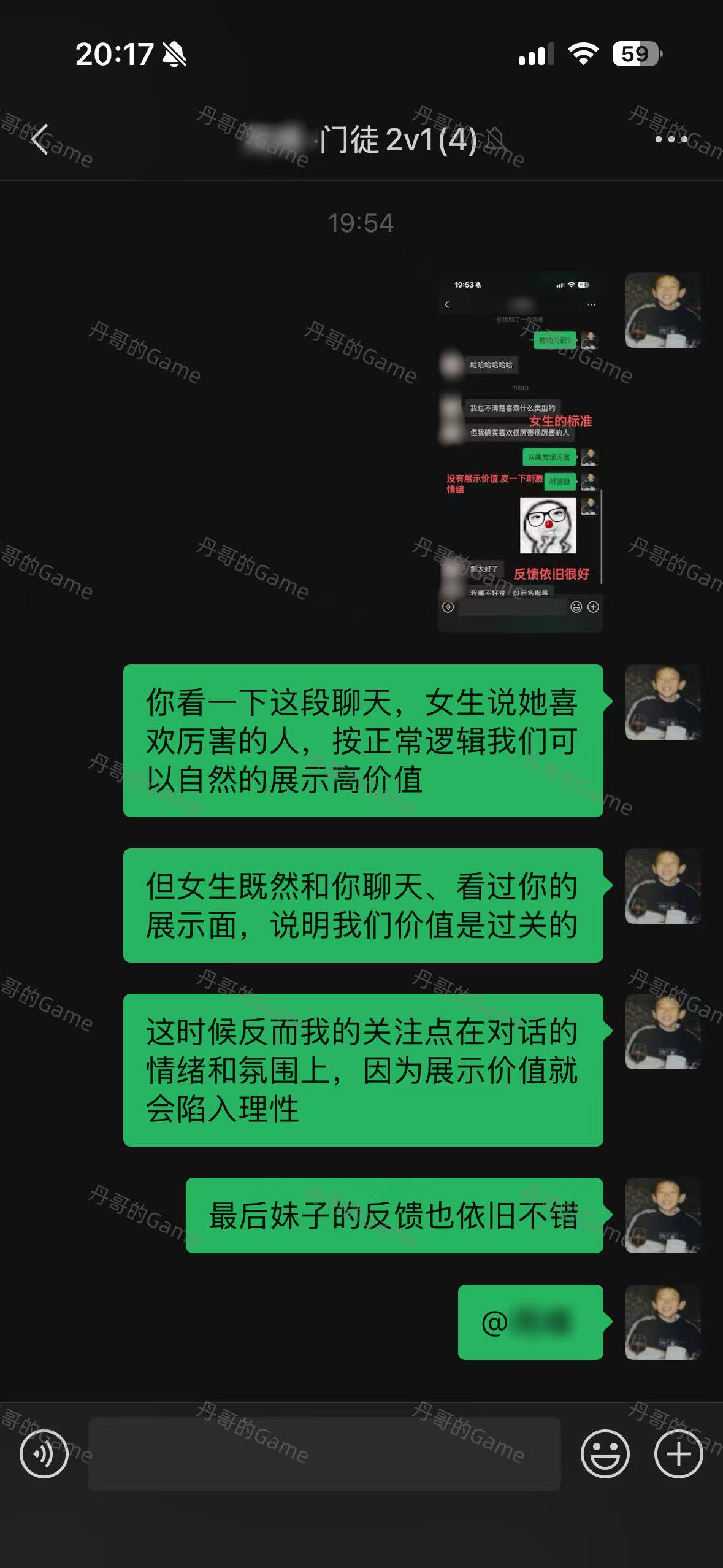 门徒木木1月10日找丹哥续拍展示面。 在朋友圈已经有公开女朋友的状态下,吸引了一个电商主播模特妹子私聊、且窗口爆炸! 丹哥点评好的朋友圈要素: 1 根据个人情况突出优势,同时避开劣势 2 根据个人真实价值展...
