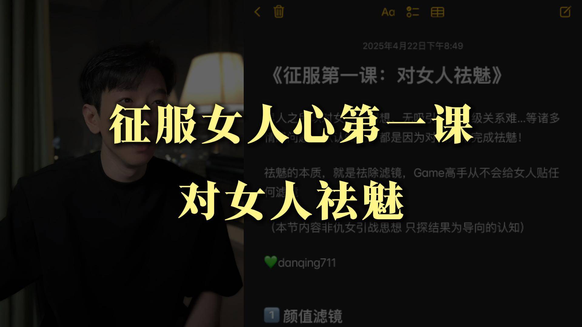 男人之所以对女人有幻想、无吸引力、升级关系难…等诸多情感问题,从认知上,都是因为对女人未完成祛魅! 祛魅的本质,就是祛除滤镜,Game高手从不会给女人贴任何滤镜 (本节内容非仇女引战思想 只探结果为导向的...